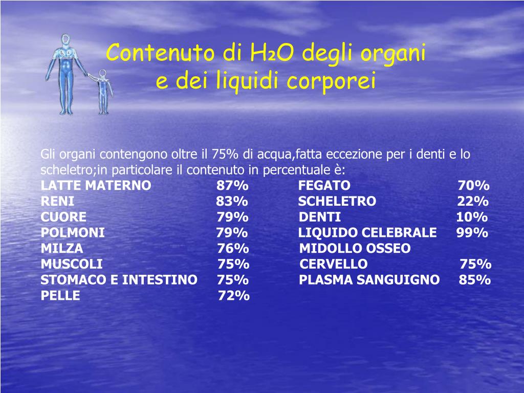 Contenuto di H2O degli organi e dei liquidi corporei Gli organi contengono oltre il 75% di acqua,fatta eccezione per i denti e lo scheletro;in particolare il contenuto in percentuale è: LATTE MATERNO 87%FEGATO 70% RENI 83% SCHELETRO 22% CUORE 79% DENTI 10% POLMONI 79% LIQUIDO CELEBRALE 99% MILZA 76% MIDOLLO OSSEO MUSCOLI 75% CERVELLO 75% STOMACO E INTESTINO 75% PLASMA SANGUIGNO 85% PELLE 72%