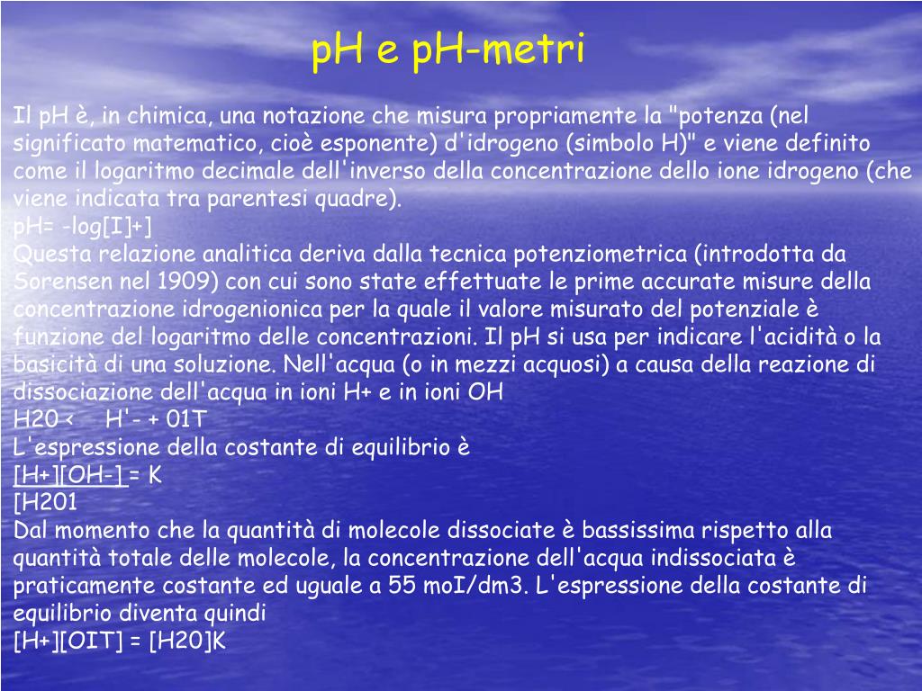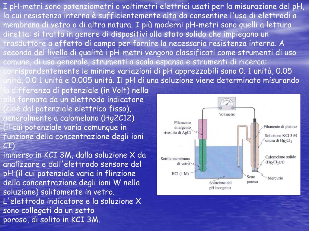 I pH-metri sono potenziometri o voltimetri elettrici usati per la misurazione del pH, la cui resistenza interna è sufficientemente alta da consentire l'uso di elettrodi a membrana di vetro o di altra natura. I più moderni pH-metri sono quelli a lettura diretta: si tratta in genere di dispositivi allo stato solido che impiegano un trasduttore a effetto di campo per fornire la necessaria resistenza interna. A seconda del livello di qualità i pH-metri vengono classificati come strumenti di uso comune, di uso generale, strumenti a scala espansa e strumenti di ricerca: corrispondentemente le minime variazioni di pH apprezzabili sono 0. 1 unità, 0.05 unità, 0.0 1 unità e 0.005 unità. Il pH di una soluzione viene determinato misurando la differenza di potenziale (in Volt) nella pila formata da un elettrodo indicatore (cioè dal potenziale elettrico fisso), generalmente a calomelano (Hg2C12) (il cui potenziale varia comunque in funzione della concentrazione degli ioni CI) immerso in KCI 3M, dalla soluzione X da analizzare e dall'elettrodo sensore del pH (il cui potenziale varia in flinzione della concentrazione degli ioni W nella soluzione) solitamente in vetro. L'elettrodo indicatore e la soluzione X sono collegati da un setto poroso, di solito in KCI 3M.