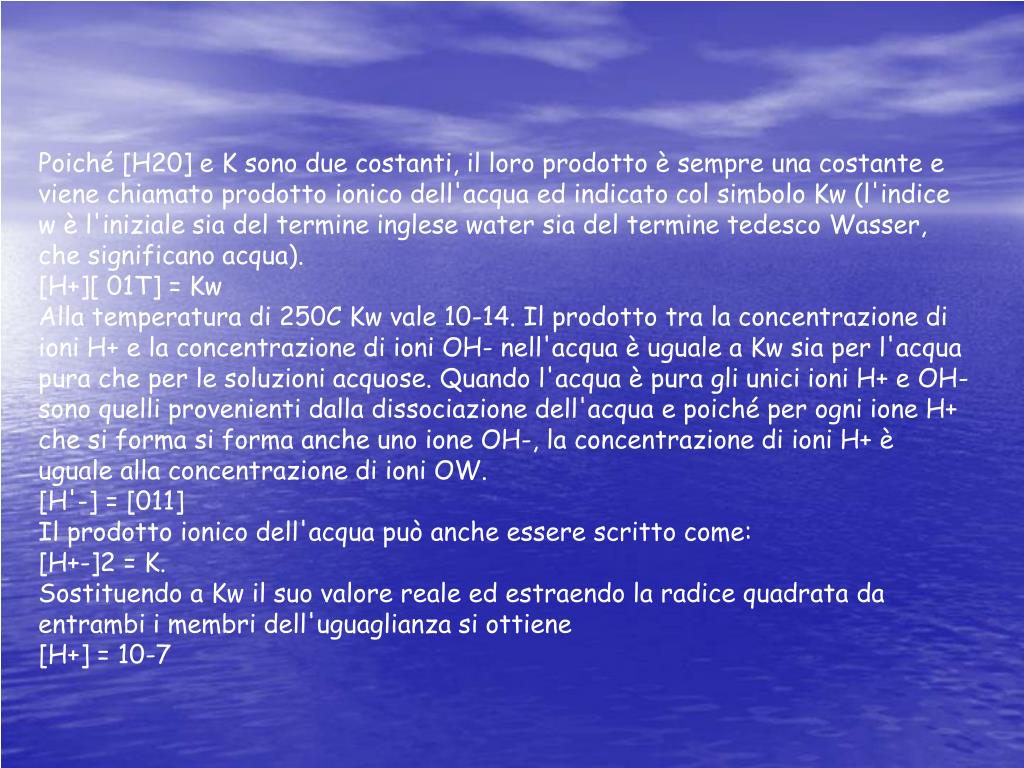 Poiché [H20] e K sono due costanti, il loro prodotto è sempre una costante e viene chiamato prodotto ionico dell'acqua ed indicato col simbolo Kw (l'indice w è l'iniziale sia del termine inglese water sia del termine tedesco Wasser, che significano acqua). [H+][ 01T] = Kw Alla temperatura di 250C Kw vale 10-14. Il prodotto tra la concentrazione di ioni H+ e la concentrazione di ioni OH- nell'acqua è uguale a Kw sia per l'acqua pura che per le soluzioni acquose. Quando l'acqua è pura gli unici ioni H+ e OH- sono quelli provenienti dalla dissociazione dell'acqua e poiché per ogni ione H+ che si forma si forma anche uno ione OH-, la concentrazione di ioni H+ è uguale alla concentrazione di ioni OW. [H'-] = [011] Il prodotto ionico dell'acqua può anche essere scritto come: [H+-]2 = K. Sostituendo a Kw il suo valore reale ed estraendo la radice quadrata da entrambi i membri dell'uguaglianza si ottiene [H+] = 10-7
