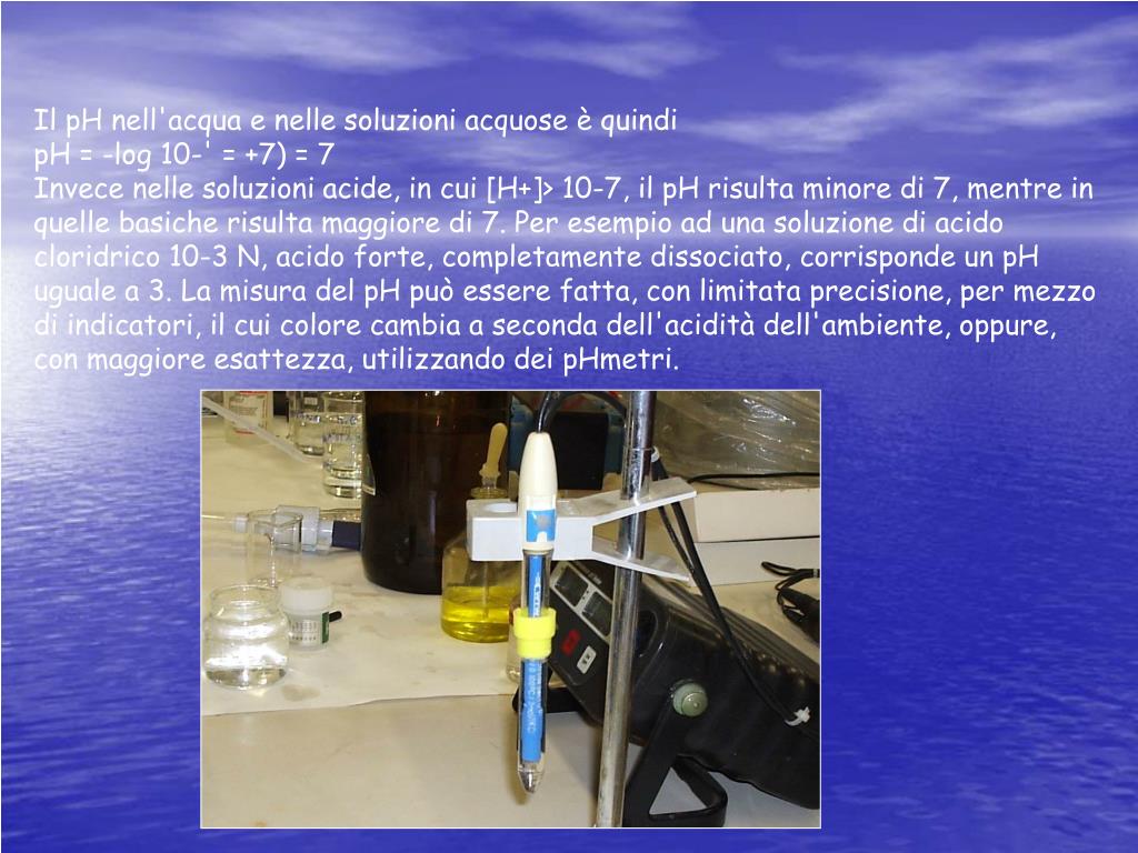 Il pH nell'acqua e nelle soluzioni acquose è quindi pH = -log 10-' = +7) = 7 Invece nelle soluzioni acide, in cui [H+]> 10-7, il pH risulta minore di 7, mentre in quelle basiche risulta maggiore di 7. Per esempio ad una soluzione di acido cloridrico 10-3 N, acido forte, completamente dissociato, corrisponde un pH uguale a 3. La misura del pH può essere fatta, con limitata precisione, per mezzo di indicatori, il cui colore cambia a seconda dell'acidità dell'ambiente, oppure, con maggiore esattezza, utilizzando dei pHmetri.