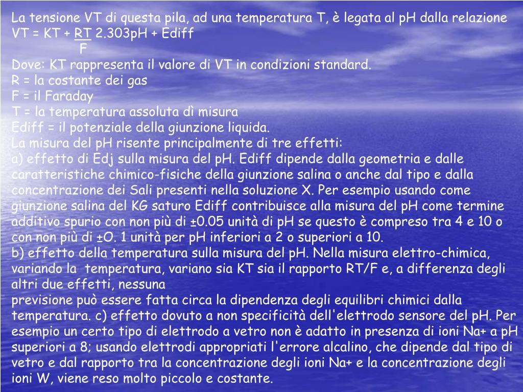 La tensione VT di questa pila, ad una temperatura T, è legata al pH dalla relazione VT = KT + RT 2.303pH + Ediff F Dove: KT rappresenta il valore di VT in condizioni standard. R = la costante dei gas F = il Faraday T = la temperatura assoluta dì misura Ediff = il potenziale della giunzione liquida. La misura del pH risente principalmente di tre effetti: a) effetto di Edj sulla misura del pH. Ediff dipende dalla geometria e dalle caratteristiche chimico-fisiche della giunzione salina o anche dal tipo e dalla concentrazione dei Sali presenti nella soluzione X. Per esempio usando come giunzione salina del KG saturo Ediff contribuisce alla misura del pH come termine additivo spurio con non più di ±0.05 unità di pH se questo è compreso tra 4 e 10 o con non più di ±O. 1 unità per pH inferiori a 2 o superiori a 10. b) effetto della temperatura sulla misura del pH. Nella misura elettro-chimica, variando la temperatura, variano sia KT sia il rapporto RT/F e, a differenza degli altri due effetti, nessuna previsione può essere fatta circa la dipendenza degli equilibri chimici dalla temperatura. c) effetto dovuto a non specificità dell'elettrodo sensore del pH. Per esempio un certo tipo di elettrodo a vetro non è adatto in presenza di ioni Na+ a pH superiori a 8; usando elettrodi appropriati l'errore alcalino, che dipende dal tipo di vetro e dal rapporto tra la concentrazione degli ioni Na+ e la concentrazione degli ioni W, viene reso molto piccolo e costante.