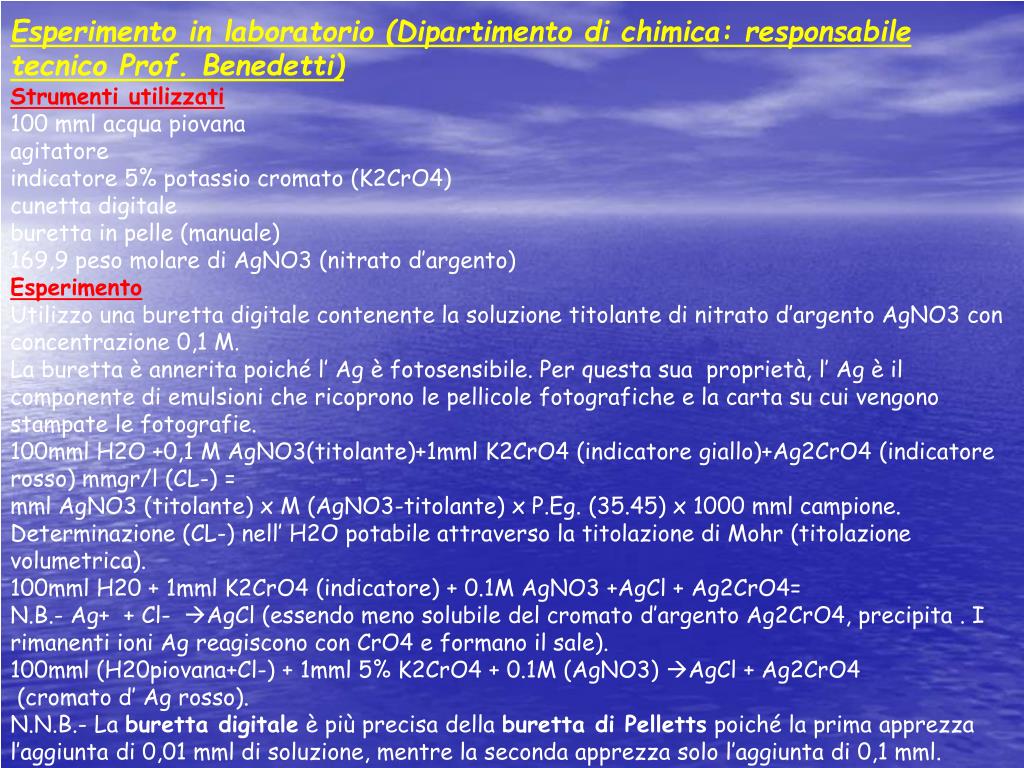 Esperimento in laboratorio (Dipartimento di chimica: responsabile tecnico Prof. Benedetti) Strumenti utilizzati 100 mml acqua piovana agitatore indicatore 5% potassio cromato (K2CrO4) cunetta digitale buretta in pelle (manuale) 169,9 peso molare di AgNO3 (nitrato d’argento) Esperimento Utilizzo una buretta digitale contenente la soluzione titolante di nitrato d’argento AgNO3 con concentrazione 0,1 M. La buretta è annerita poiché l’ Ag è fotosensibile. Per questa sua proprietà, l’ Ag è il componente di emulsioni che ricoprono le pellicole fotografiche e la carta su cui vengono stampate le fotografie. 100mml H2O +0,1 M AgNO3(titolante)+1mml K2CrO4 (indicatore giallo)+Ag2CrO4 (indicatore rosso) mmgr/l (CL-) = mml AgNO3 (titolante) x M (AgNO3-titolante) x P.Eg. (35.45) x 1000 mml campione. Determinazione (CL-) nell’ H2O potabile attraverso la titolazione di Mohr (titolazione volumetrica). 100mml H20 + 1mml K2CrO4 (indicatore) + 0.1M AgNO3 +AgCl + Ag2CrO4= N.B.- Ag+ + Cl- AgCl (essendo meno solubile del cromato d’argento Ag2CrO4, precipita . I rimanenti ioni Ag reagiscono con CrO4 e formano il sale). 100mml (H20piovana+Cl-) + 1mml 5% K2CrO4 + 0.1M (AgNO3) AgCl + Ag2CrO4 (cromato d’ Ag rosso). N.N.B.- La buretta digitale è più precisa della buretta di Pelletts poiché la prima apprezza l’aggiunta di 0,01 mml di soluzione, mentre la seconda apprezza solo l’aggiunta di 0,1 mml.