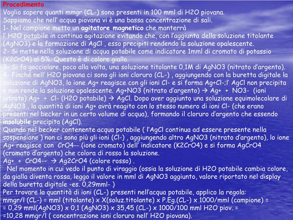 Procedimento Voglio sapere quanti mmgr (CL-) sono presenti in 100 mml di H2O piovana. Sappiamo che nell’ acqua piovana vi è una bassa concentrazione di sali. 1- Nel campione metto un agitatore magnetico che manterrà l’ H2O potabile in continua agitazione evitando che, con l’aggiunta della soluzione titolante (AgNO3) e la formazione di AgCl , esso precipiti rendendo la soluzione opalescente. 2- Si mette nella soluzione di acqua potabile come indicatore 1mml di cromato di potassio (K2CrO4) al 5%. Questo è di colore giallo. 3- Si fa gocciolare, poco alla volta, una soluzione titolante 0,1M di AgNO3 (nitrato d’argento). 4- Finché nell’ H2O piovana ci sono gli ioni cloruro (CL-) , aggiungendo con la buretta digitale la soluzione di AgNO3, lo ione Ag+ reagisce con gli ioni Cl- e si forma Ag+Cl-;l’ AgCl non precipita e non rende la soluzione opalescente. Ag+NO3 (nitrato d’argento) Ag+ + NO3- (ioni nitrato) Ag+ + Cl- (H2O potabile) AgCl. Dopo aver aggiunto una soluzione equimolecolare di AgNO3 , la quantità di ioni Ag+ avrà reagito con lo stesso numero di ioni Cl- (che erano presenti nel becker in un certo volume di acqua), formando il cloruro d’argento che essendo insolubile precipita (AgCl). Quando nel becker contenente acqua potabile ( l’AgCl continua ad essere presente nella sospensione ) non ci sono più gli ioni (Cl-) , aggiungendo altro AgNO3 (nitrato d’argento), lo ione Ag+ reagisce con CrO4-- (ione cromato) dell’ indicatore (K2CrO4) e si forma AgCrO4 (cromato d’argento) che colora di rosso la soluzione. Ag+ + CrO4-- Ag2CrO4 (colore rosso) . Nel momento in cui vedo il punto di viraggio (ossia la soluzione di H2O potabile cambia colore, da gialla diventa rossa, leggo il valore in mml di AgNO3 aggiunto, valore riportato nel display della buretta digitale -es. 0,29mml- ) Per trovare la quantità di ioni (CL-) presenti nell’acqua potabile, applico la regola: mmgr/l (CL-) = mml (titolante) x X(soluz.titolante) x P.Eg.(CL-) x 1000/mml (campione) = = 0,29 mml(AgNO3) x 0,1 (AgNO3) x 35,45 (CL-) x 1000/100 mml H2O piov. = =10,28 mmgr/l ( concentrazione ioni cloruro nell’ H2O piovana).