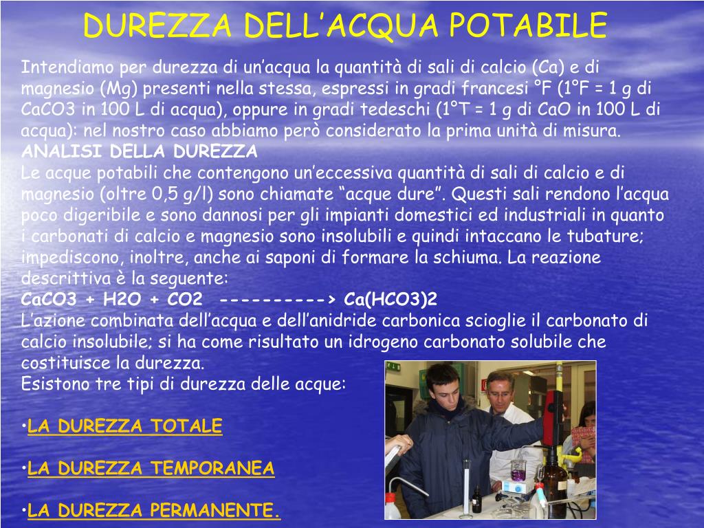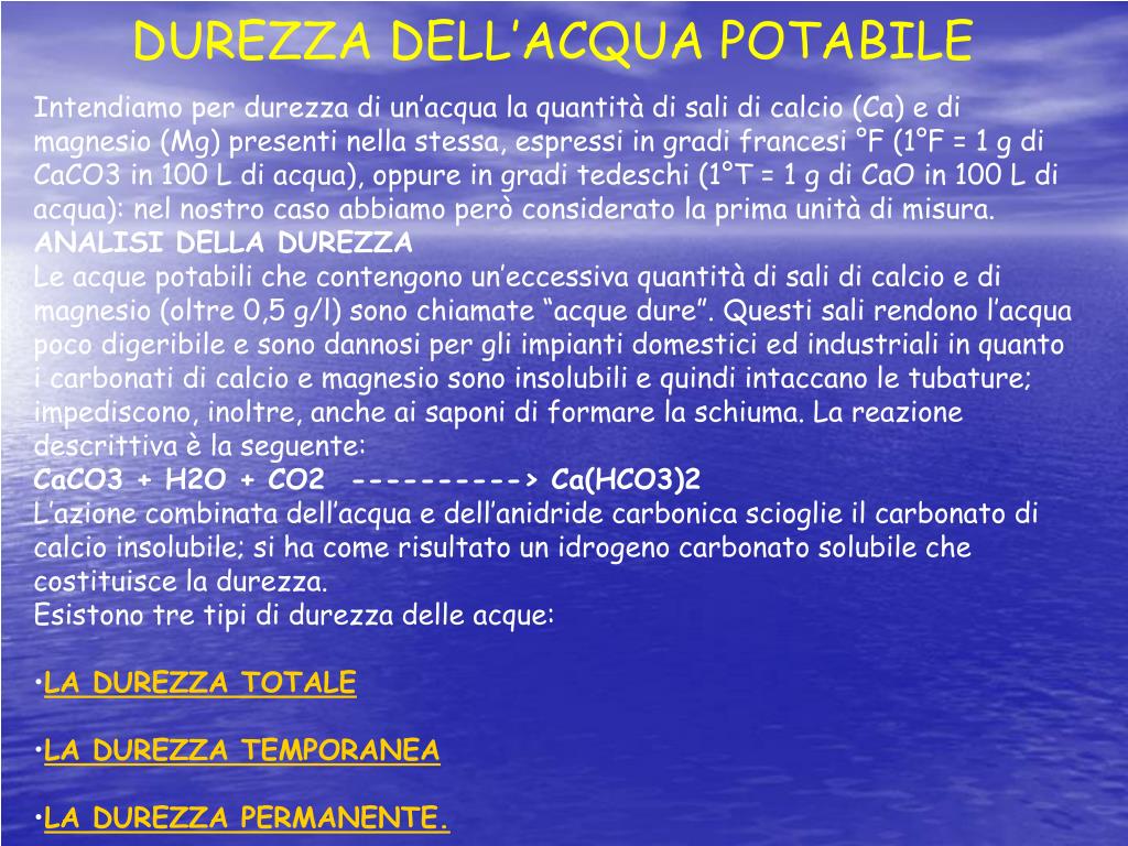 DUREZZA DELL’ACQUA POTABILE • Intendiamo per durezza di un’acqua la quantità di sali di calcio (Ca) e di magnesio (Mg) presenti nella stessa, espressi in gradi francesi °F (1°F = 1 g di CaCO3 in 100 L di acqua), oppure in gradi tedeschi (1°T = 1 g di CaO in 100 L di acqua): nel nostro caso abbiamo però considerato la prima unità di misura. • ANALISI DELLA DUREZZA • Le acque potabili che contengono un’eccessiva quantità di sali di calcio e di magnesio (oltre 0,5 g/l) sono chiamate “acque dure”. Questi sali rendono l’acqua poco digeribile e sono dannosi per gli impianti domestici ed industriali in quanto i carbonati di calcio e magnesio sono insolubili e quindi intaccano le tubature; impediscono, inoltre, anche ai saponi di formare la schiuma. La reazione descrittiva è la seguente: • CaCO3 + H2O + CO2 ----------> Ca(HCO3)2 • L’azione combinata dell’acqua e dell’anidride carbonica scioglie il carbonato di calcio insolubile; si ha come risultato un idrogeno carbonato solubile che costituisce la durezza. • Esistono tre tipi di durezza delle acque: • LA DUREZZA TOTALE • LA DUREZZA TEMPORANEA • LA DUREZZA PERMANENTE.