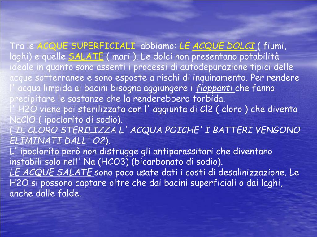 Tra le ACQUE SUPERFICIALI abbiamo:LE ACQUE DOLCI( fiumi, laghi) e quelle SALATE ( mari ). Le dolci non presentano potabilità ideale in quanto sono assenti i processi di autodepurazione tipici delle acque sotterranee e sono esposte a rischi di inquinamento. Per rendere l' acqua limpida ai bacini bisogna aggiungere i floppanti che fanno precipitare le sostanze che la renderebbero torbida. l' H2O viene poi sterilizzata con l' aggiunta di Cl2 ( cloro ) che diventa NaClO ( ipoclorito di sodio). ( IL CLORO STERILIZZA L' ACQUA POICHE' I BATTERI VENGONO ELIMINATI DALL' O2). L' ipoclorito però non distrugge gli antiparassitari che diventano instabili solo nell' Na (HCO3) (bicarbonato di sodio). LE ACQUE SALATE sono poco usate dati i costi di desalinizzazione. Le H2O si possono captare oltre che dai bacini superficiali o dai laghi, anche dalle falde.