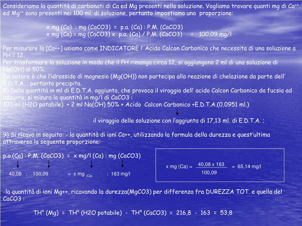 Esperimento • ATTREZZATURA. • - 100 ml di H2O potabile; • - Becher; • - 0,0951 ml E.D.T.A.; • - 2 gocce di nero eriocromo T; • - Tampone ammoniacale : NH3; • - Buretta; • - Sostegno per la buretta; • - Pipetta tarata a doppio senso; • - Pipetta dosatrice automatica; • - Agitatore. • - Acido Calcon Carbonico (indicatore); • - 2 ml. di Na(OH) • PROCEDURA • 1) 100 ml di H2O potabile in un becher; • 2) aggiunta 10 ml. della soluzione tampone ammoniacale (PH = 10); • 3) aggiunta 2 gocce di NECT (indicatore); • 4) aggiunta 0,0951 ml. di E.D.T.A., fino a viraggio della soluzione; • 5) Determinazione della quantità di E.D.T.A. (acqua potabile) = 22,78 ml. • 6) TH° = ml E.D.T.A. x M x Eq. (CaCO3) x 1000/ml. campione • (Durezza) • TH° (H20 potabile) = 22,78 ml. x 0,0951 x 100,9 x 1000/100 ml. = 216,8 mg/l CaCO3 • 7) Durezza tot. = 216,8/10 mg/l = 21,68 ° F.