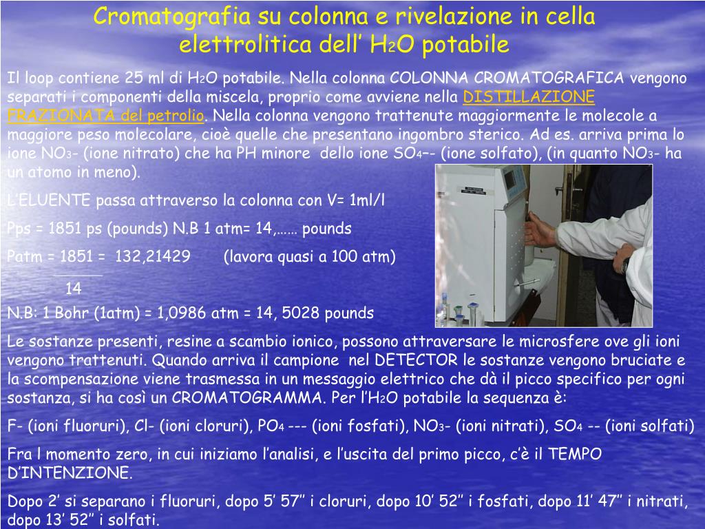 Cromatografia su colonna e rivelazione in cella elettrolitica dell’ H2O potabile Il loop contiene 25 ml di H2O potabile. Nella colonna COLONNA CROMATOGRAFICA vengono separati i componenti della miscela, proprio come avviene nella DISTILLAZIONE FRAZIONATA del petrolio. Nella colonna vengono trattenute maggiormente le molecole a maggiore peso molecolare, cioè quelle che presentano ingombro sterico. Ad es. arriva prima lo ione NO3- (ione nitrato) che ha PH minore dello ione SO4–- (ione solfato), (in quanto NO3- ha un atomo in meno). L’ELUENTE passa attraverso la colonna con V= 1ml/l Pps = 1851 ps (pounds) N.B 1 atm= 14,…… pounds Patm = 1851 = 132,21429 (lavora quasi a 100 atm) N.B: 1 Bohr (1atm) = 1,0986 atm = 14, 5028 pounds Le sostanze presenti, resine a scambio ionico, possono attraversare le microsfere ove gli ioni vengono trattenuti. Quando arriva il campione nel DETECTOR le sostanze vengono bruciate e la scompensazione viene trasmessa in un messaggio elettrico che dà il picco specifico per ogni sostanza, si ha così un CROMATOGRAMMA. Per l’H2O potabile la sequenza è: F- (ioni fluoruri), Cl- (ioni cloruri), PO4 --- (ioni fosfati), NO3- (ioni nitrati), SO4 -- (ioni solfati) Fra l momento zero, in cui iniziamo l’analisi, e l’uscita del primo picco, c’è il TEMPO D’INTENZIONE. Dopo 2’ si separano i fluoruri, dopo 5’ 57’’ i cloruri, dopo 10’ 52’’ i fosfati, dopo 11’ 47’’ i nitrati, dopo 13’ 52’’ i solfati. 14