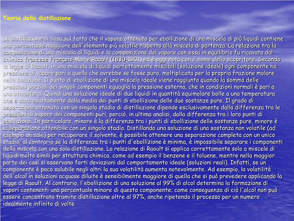 Teoria della distillazione La distillazione si basa sul fatto che il vapore ottenuto per ebollizione di una miscela di più liquidi contiene una percentuale maggiore dell'elemento più volatile rispetto alla miscela di partenza. La relazione tra la composizione di una miscela di liquidi e la composizione del vapore con essa in equilibrio fu ricavata dal chimico francese François-Marie Raoult (1830-1901) ed è oggi nota con il nome dello scopritore. Secondo la legge di Raoult, in una miscela di liquidi perfettamente miscibili (soluzione ideale) ogni componente ha pressione di vapore pari a quella che avrebbe se fosse puro, moltiplicata per la propria frazione molare nella soluzione. Il punto di ebollizione di una miscela ideale viene raggiunto quando la somma delle pressioni parziali dei singoli componenti eguaglia la pressione esterna, che in condizioni normali è pari a una atmosfera. Quindi una soluzione ideale di due liquidi in quantità equimolare bolle a una temperatura che è data esattamente dalla media dei punti di ebollizione delle due sostanze pure. Il grado di separazione ottenuto con un singolo stadio di distillazione dipende esclusivamente dalla differenza tra le pressioni di vapore dei componenti puri, perciò, in ultima analisi, dalla differenza tra i loro punti di ebollizione. In particolare, minore è la differenza tra i punti di ebollizione delle sostanze pure, minore è la separazione ottenibile con un singolo stadio. Distillando una soluzione di una sostanza non volatile (ad esempio un sale) per recuperare il solvente, è possibile ottenere una separazione completa con un unico stadio; al contrario se la differenza tra i punti d'ebollizione è minima, è impossibile separare i componenti della miscela con una sola distillazione. La relazione di Raoult si applica correttamente solo a miscele di liquidi molto simili per struttura chimica, come ad esempio il benzene e il toluene, mentre nella maggior parte dei casi si osservano forti deviazioni dal comportamento ideale (soluzioni reali). Infatti, se un componente è poco solubile negli altri la sua volatilità aumenta notevolmente. Ad esempio, la volatilità dell'alcol in soluzioni acquose diluite è sensibilmente maggiore di quella che si può prevedere applicando la legge di Raoult. Al contrario, l'ebollizione di una soluzione al 99% di alcol determina la formazione di vapori contenenti una percentuale minore di questo componente; come conseguenza di ciò l'alcol non può essere concentrato tramite distillazione oltre al 97%, anche ripetendo il processo per un numero idealmente infinito di volte