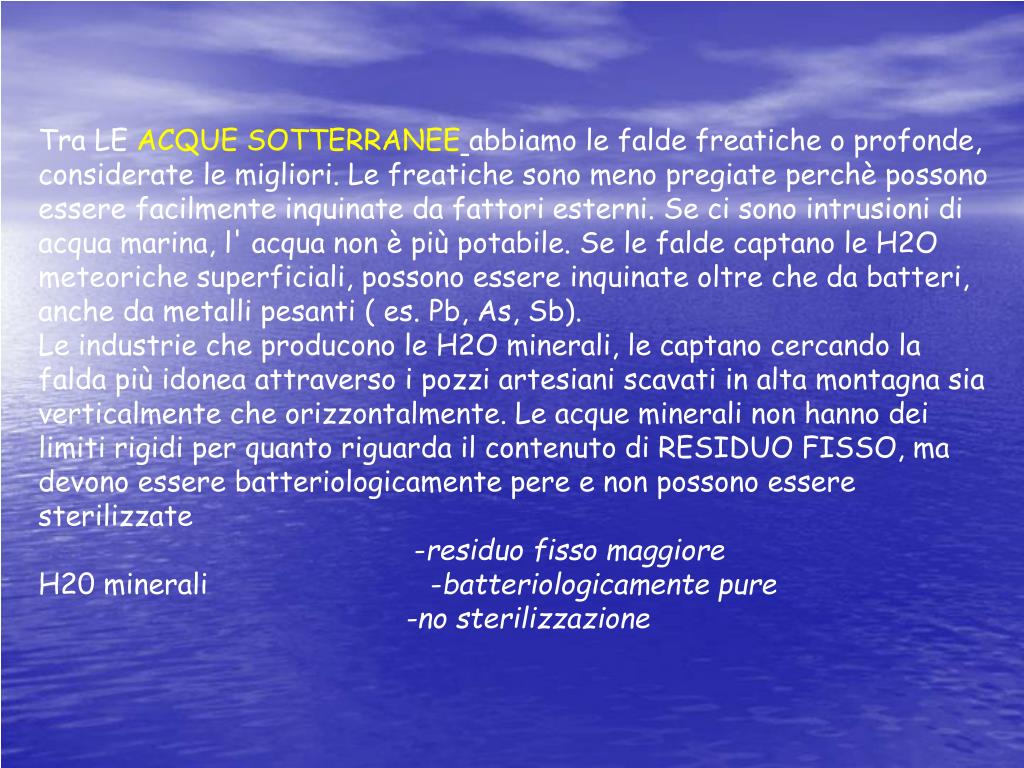Tra LE ACQUE SOTTERRANEEabbiamo le falde freatiche o profonde, considerate le migliori. Le freatiche sono meno pregiate perchè possono essere facilmente inquinate da fattori esterni. Se ci sono intrusioni di acqua marina, l' acqua non è più potabile. Se le falde captano le H2O meteoriche superficiali, possono essere inquinate oltre che da batteri, anche da metalli pesanti ( es. Pb, As, Sb). Le industrie che producono le H2O minerali, le captano cercando la falda più idonea attraverso i pozzi artesiani scavati in alta montagna sia verticalmente che orizzontalmente. Le acque minerali non hanno dei limiti rigidi per quanto riguarda il contenuto di RESIDUO FISSO, ma devono essere batteriologicamente pere e non possono essere sterilizzate -residuo fisso maggiore H20 minerali -batteriologicamente pure -no sterilizzazione