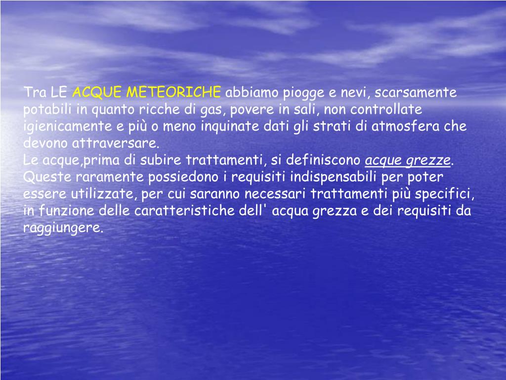 Tra LE ACQUE METEORICHE abbiamo piogge e nevi, scarsamente potabili in quanto ricche di gas, povere in sali, non controllate igienicamente e più o meno inquinate dati gli strati di atmosfera che devono attraversare. Le acque,prima di subire trattamenti, si definiscono acque grezze. Queste raramente possiedono i requisiti indispensabili per poter essere utilizzate, per cui saranno necessari trattamenti più specifici, in funzione delle caratteristiche dell' acqua grezza e dei requisiti da raggiungere.