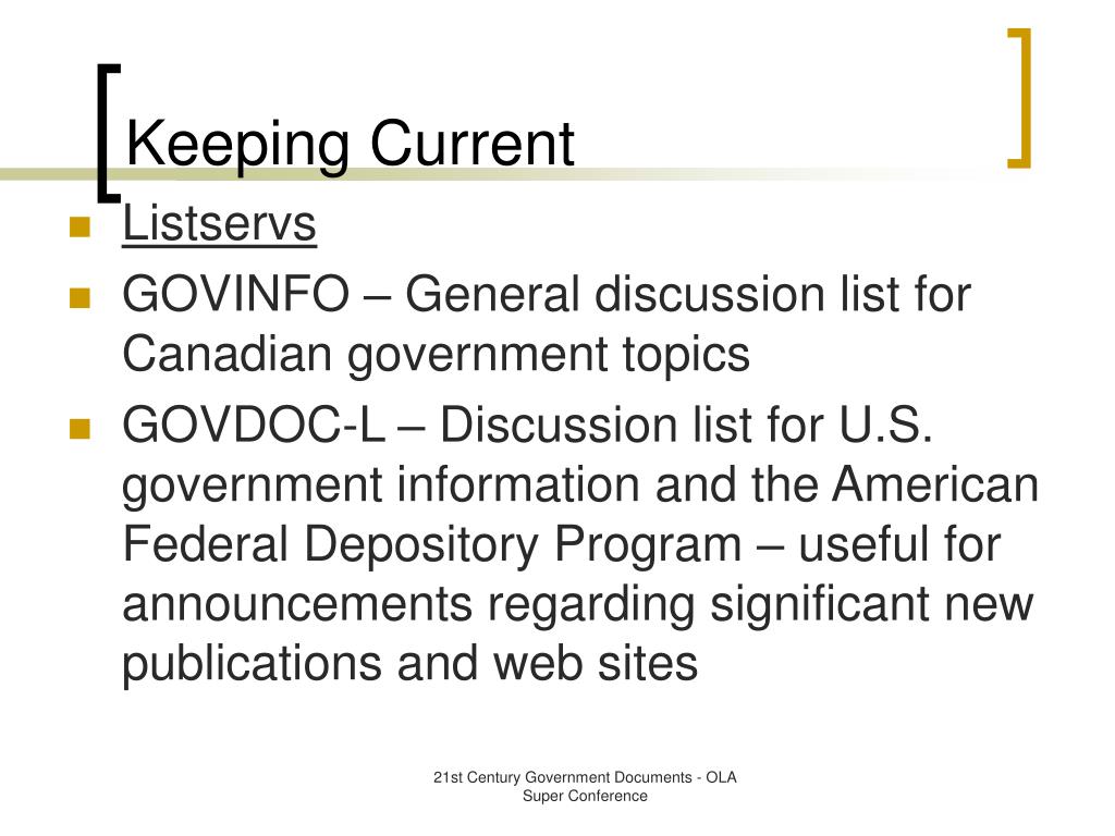 Keeping Current • Listservs • GOVINFO – General discussion list for Canadian government topics • GOVDOC-L – Discussion list for U.S. government information and the American Federal Depository Program – useful for announcements regarding significant new publications and web sites 21st Century Government Documents - OLA Super Conference