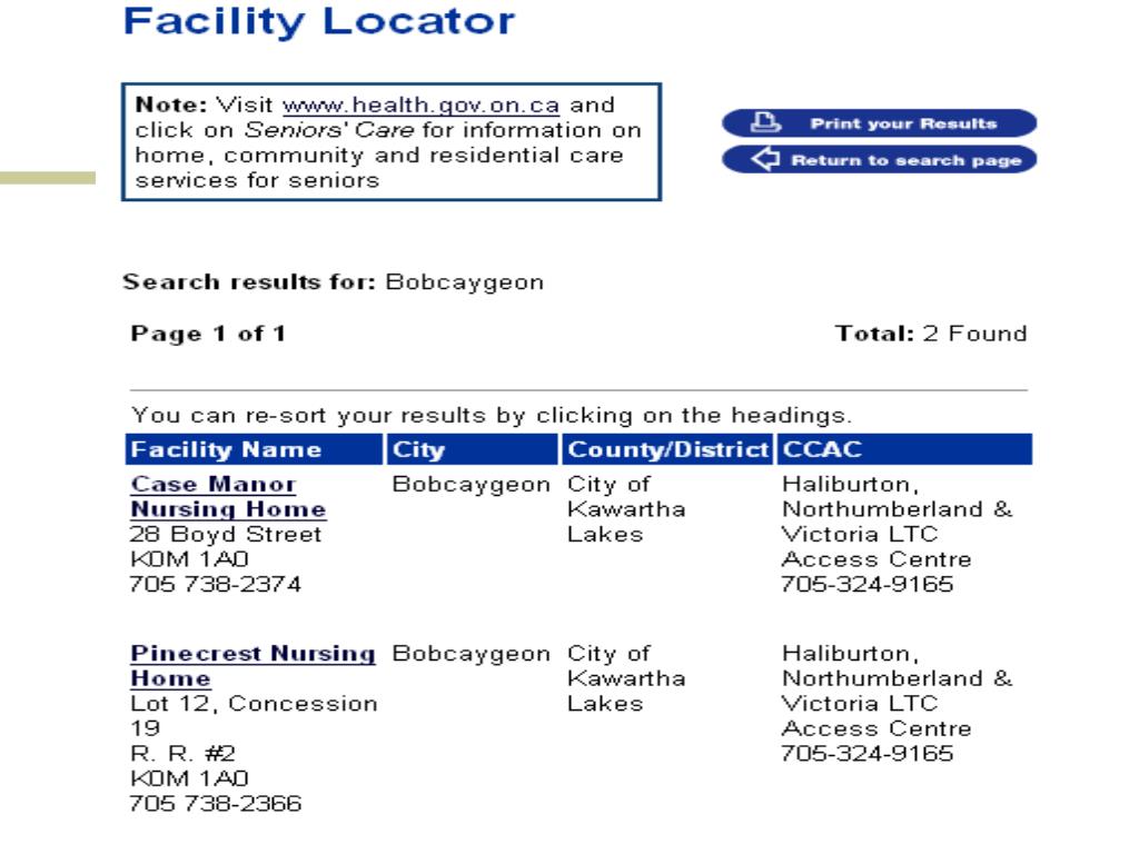 Health • Ministry of Health and Long-Term Care http://www.health.gov.on.ca/ • Many useful functions but some are hidden • Long-term care facility locator: http://www.ltccareers.com/FacilityFrame/english/ • “I need to locate a long-term care facility in Bobcaygeon.” 21st Century Government Documents - OLA Super Conference