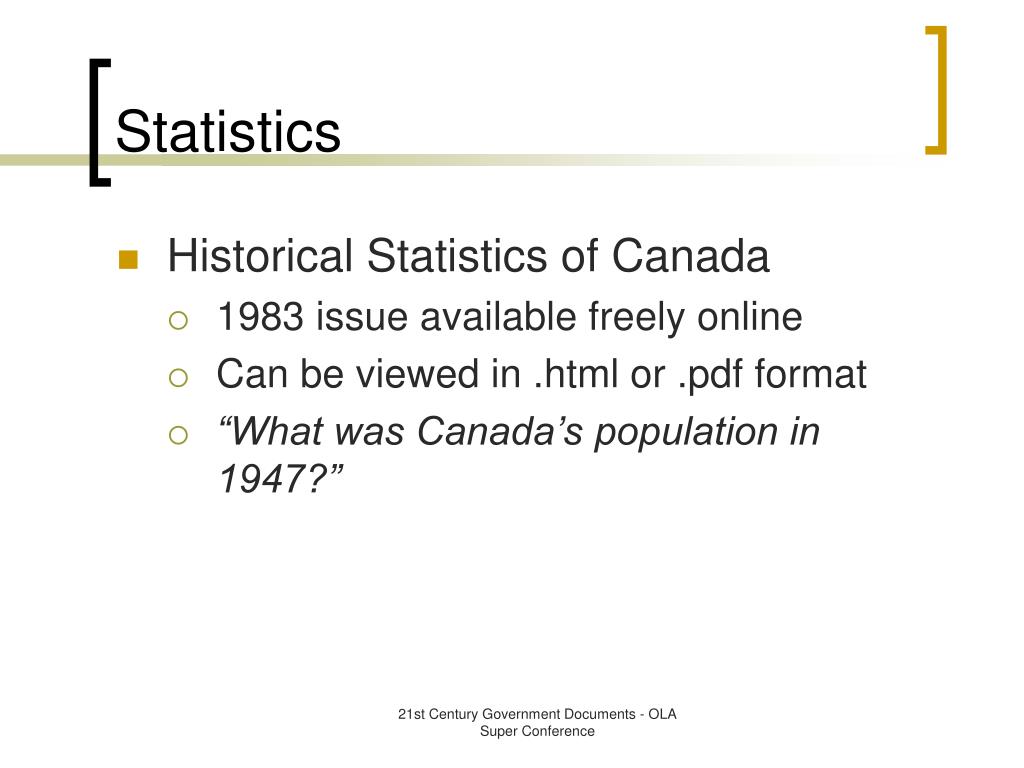 Statistics • Canada • Statistics Canada: www.statcan.ca/ • The Daily – a first stop for current statistics • The Daily is archived online to June 1995 • Consumer Price Index • Economic Indicators • Construction • Employment • Population 21st Century Government Documents - OLA Super Conference