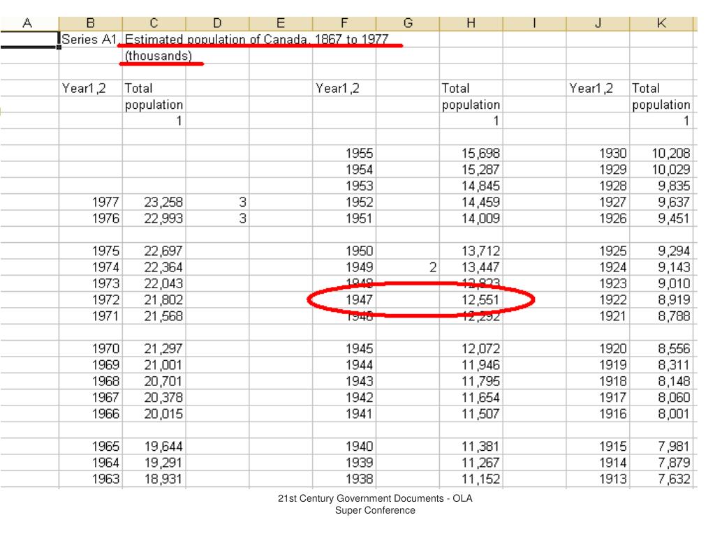 Statistics • Historical Statistics of Canada • 1983 issue available freely online • Can be viewed in .html or .pdf format • “What was Canada’s population in 1947?” 21st Century Government Documents - OLA Super Conference