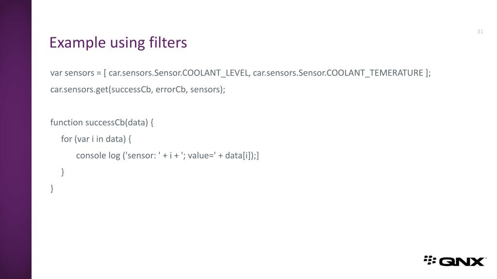 QNX CAR 2.0 sensors example qnx.sensors.get( speed, tire_pressure_fl, tire_pressure_fr, ...) Returns: { speed: 0, tire_pressure_fl: 31, tire_pressure_fr: 31 [...] }