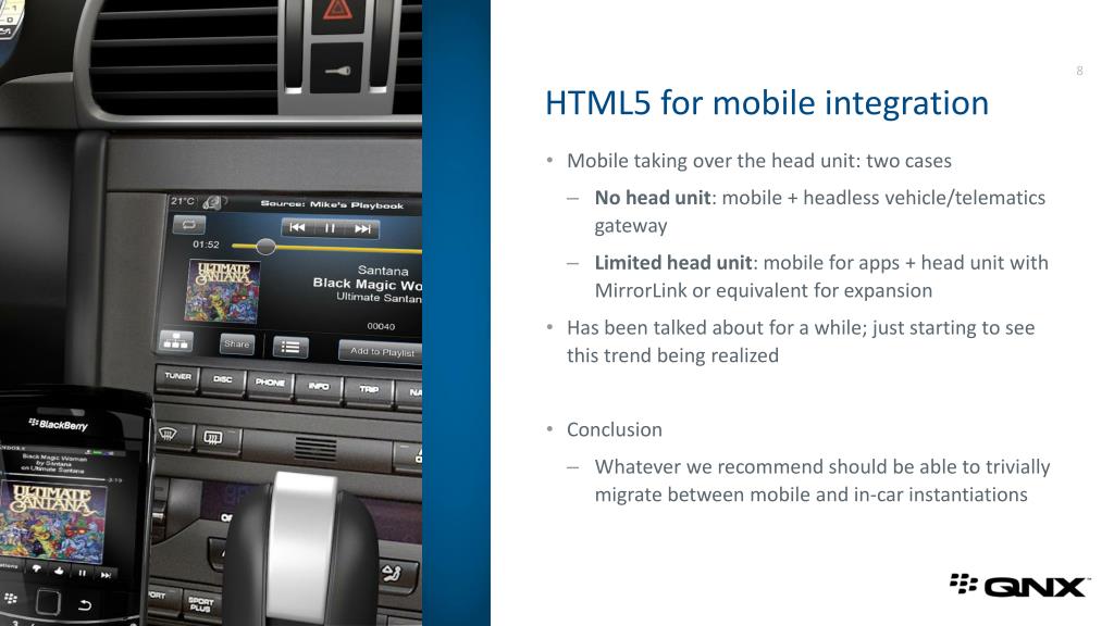 Outline • Part 1 • QNX CAR as an HTML5 proving ground • HTML5 market trends in automotive • The direction this leads us • Examples: old and new • Status of QNX contributions • Part 2 • Differences between QNX, Tizen, Webinos • Issue list for union • Proposed strategy for unionizing