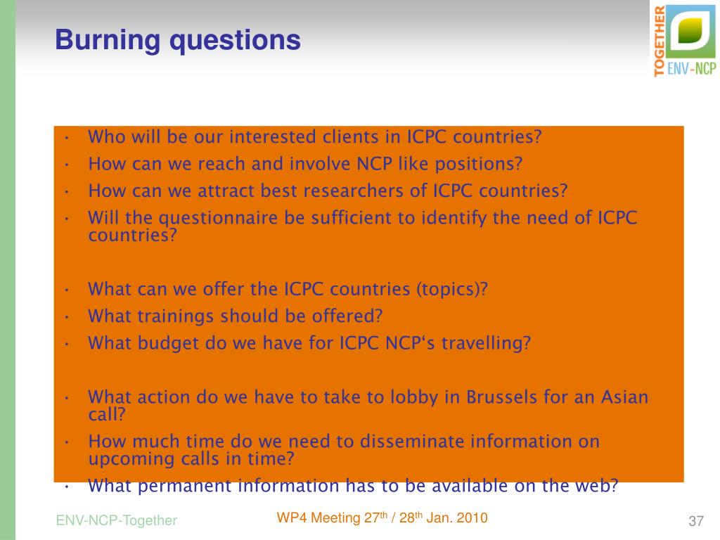 Burning questions • Who will be our interested clients in ICPC countries? • How can we reach and involve NCP like positions? • How can we attract best researchers of ICPC countries? • Will the questionnaire be sufficient to identify the need of ICPC countries? • What can we offer the ICPC countries (topics)? • What trainings should be offered? • What budget do we have for ICPC NCP‘s travelling? • What action do we have to take to lobby in Brussels for an Asian call? • How much time do we need to disseminate information on upcoming calls in time? • What permanent information has to be available on the web? WP4 Meeting 27th / 28th Jan. 2010