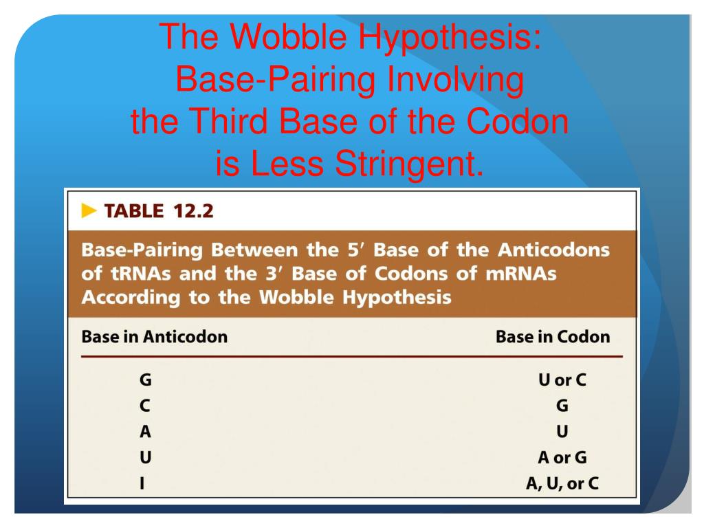 The Wobble Hypothesis:Base-Pairing Involving the Third Base of the Codon is Less Stringent.