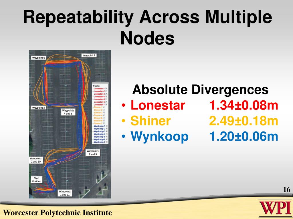 Repeatability Across Multiple Nodes • Absolute Divergences • Lonestar1.34±0.08m • Shiner 2.49±0.18m • Wynkoop 1.20±0.06m Worcester Polytechnic Institute