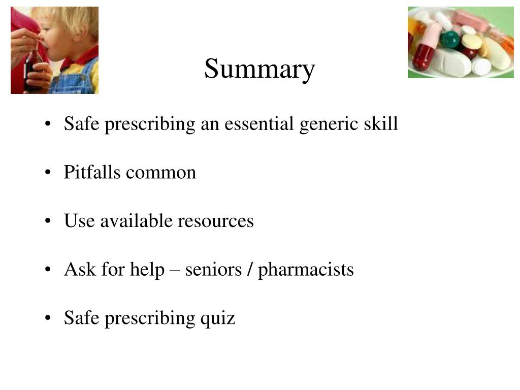 Summary • Safe prescribing an essential generic skill • Pitfalls common • Use available resources • Ask for help – seniors / pharmacists • Safe prescribing quiz
