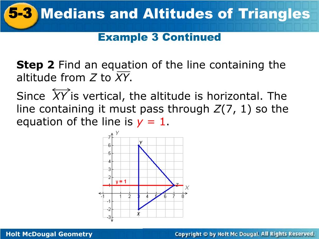 Step 2 Find an equation of the line containing the altitude from Z to XY. Since XY is vertical, the altitude is horizontal. The line containing it must pass through Z(7, 1) so the equation of the line is y = 1. Example 3 Continued