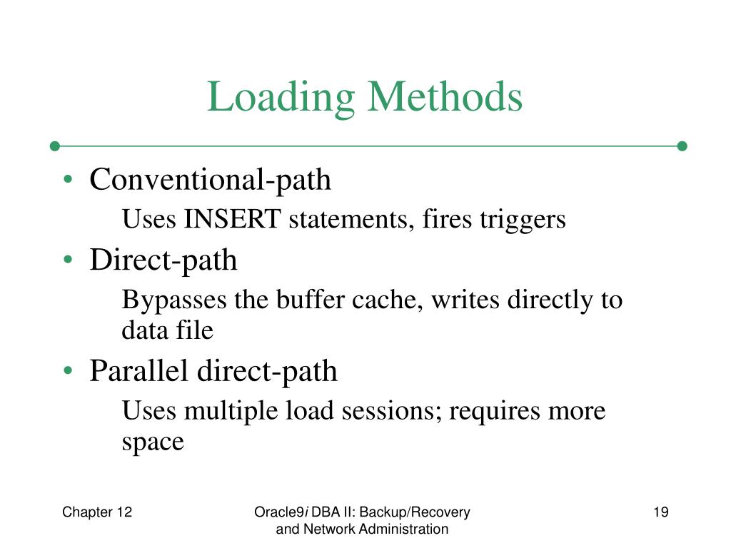 Loading Methods • Conventional-path Uses INSERT statements, fires triggers • Direct-path Bypasses the buffer cache, writes directly to data file • Parallel direct-path Uses multiple load sessions; requires more space Oracle9i DBA II: Backup/Recovery and Network Administration