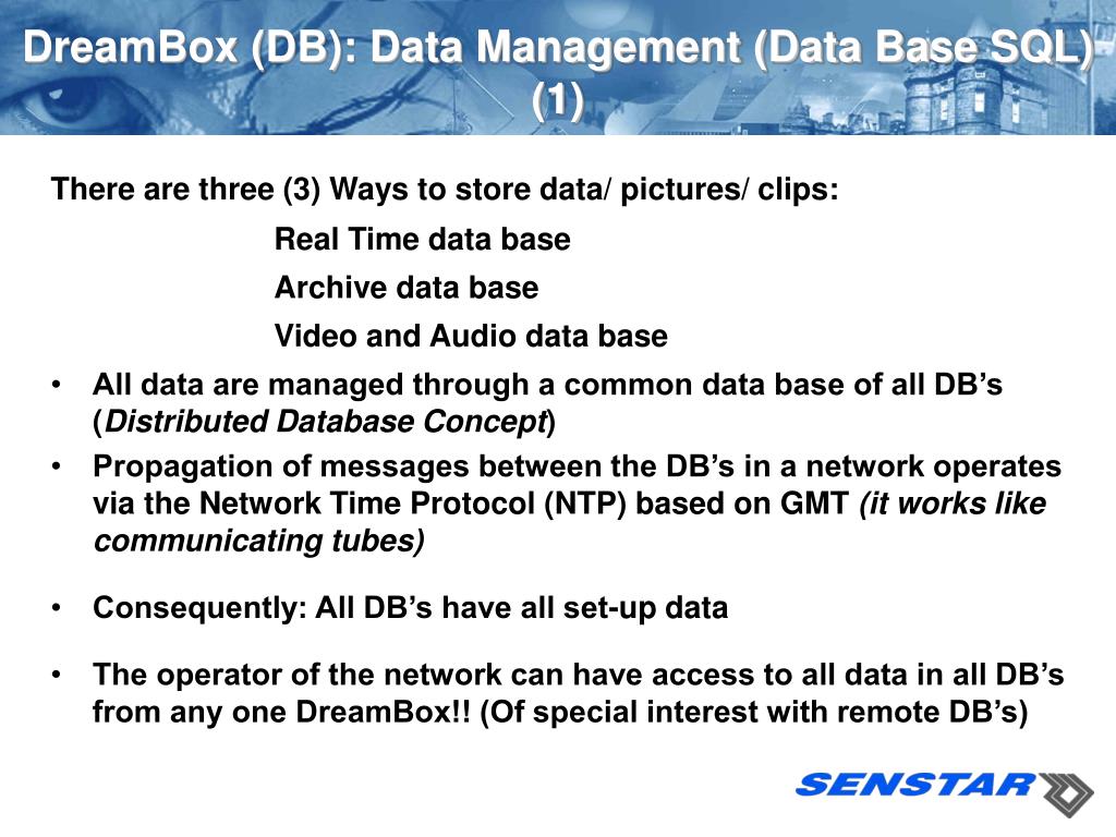 DreamBox (DB): Data Management (Data Base SQL) (1) There are three (3) Ways to store data/ pictures/ clips: Real Time data base Archive data base Video and Audio data base • All data are managed through a common data base of all DB’s (Distributed Database Concept) • Propagation of messages between the DB’s in a network operates via the Network Time Protocol (NTP) based on GMT (it works like communicating tubes) • Consequently: All DB’s have all set-up data • The operator of the network can have access to all data in all DB’s from any one DreamBox!! (Of special interest with remote DB’s)