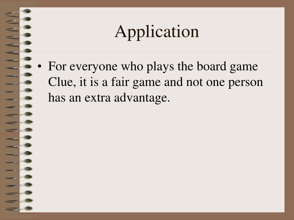 Application • For everyone who plays the board game Clue, it is a fair game and not one person has an extra advantage.