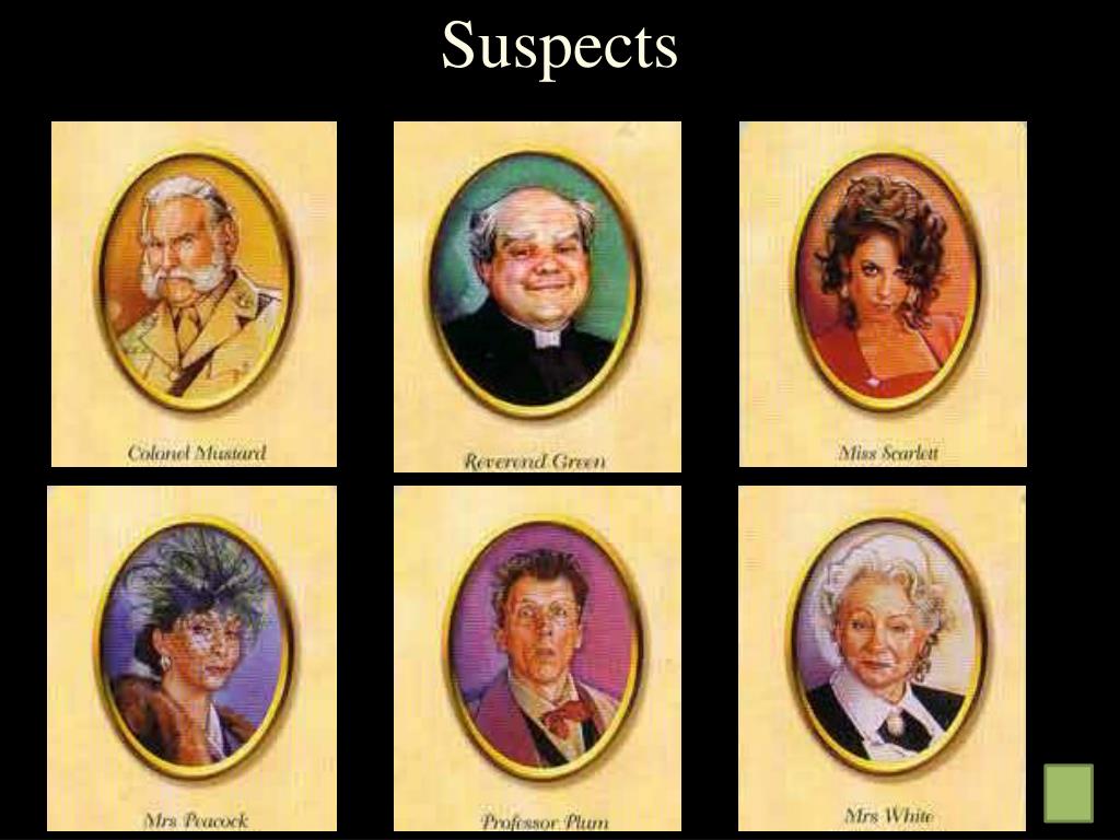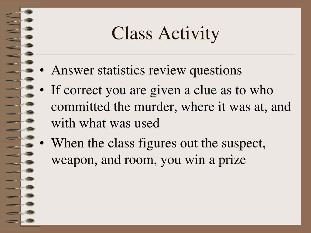 Class Activity • Answer statistics review questions • If correct you are given a clue as to who committed the murder, where it was at, and with what was used • When the class figures out the suspect, weapon, and room, you win a prize