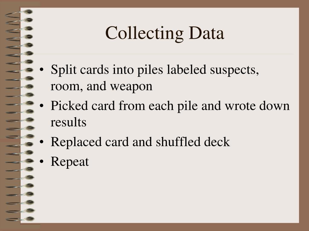 Collecting Data • Split cards into piles labeled suspects, room, and weapon • Picked card from each pile and wrote down results • Replaced card and shuffled deck • Repeat