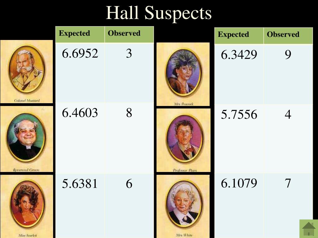 Analysis/ Conclusion of Bar Graph • It appears as though the bar graphs for the dining room, hall, and study are normally distributed with the dining room being almost uniform • For the other graphs however there are possible outliers because of the varying heights of the bars • Some graphs appear unimodal because the highest peak involves one suspect • All have good spreads