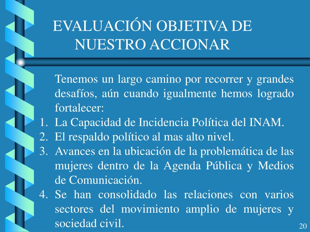 EVALUACIÓN OBJETIVA DE NUESTRO ACCIONAR • Tenemos un largo camino por recorrer y grandes desafíos, aún cuando igualmente hemos logrado fortalecer: • La Capacidad de Incidencia Política del INAM. • El respaldo político al mas alto nivel. • Avances en la ubicación de la problemática de las mujeres dentro de la Agenda Pública y Medios de Comunicación. • Se han consolidado las relaciones con varios sectores del movimiento amplio de mujeres y sociedad civil. 20