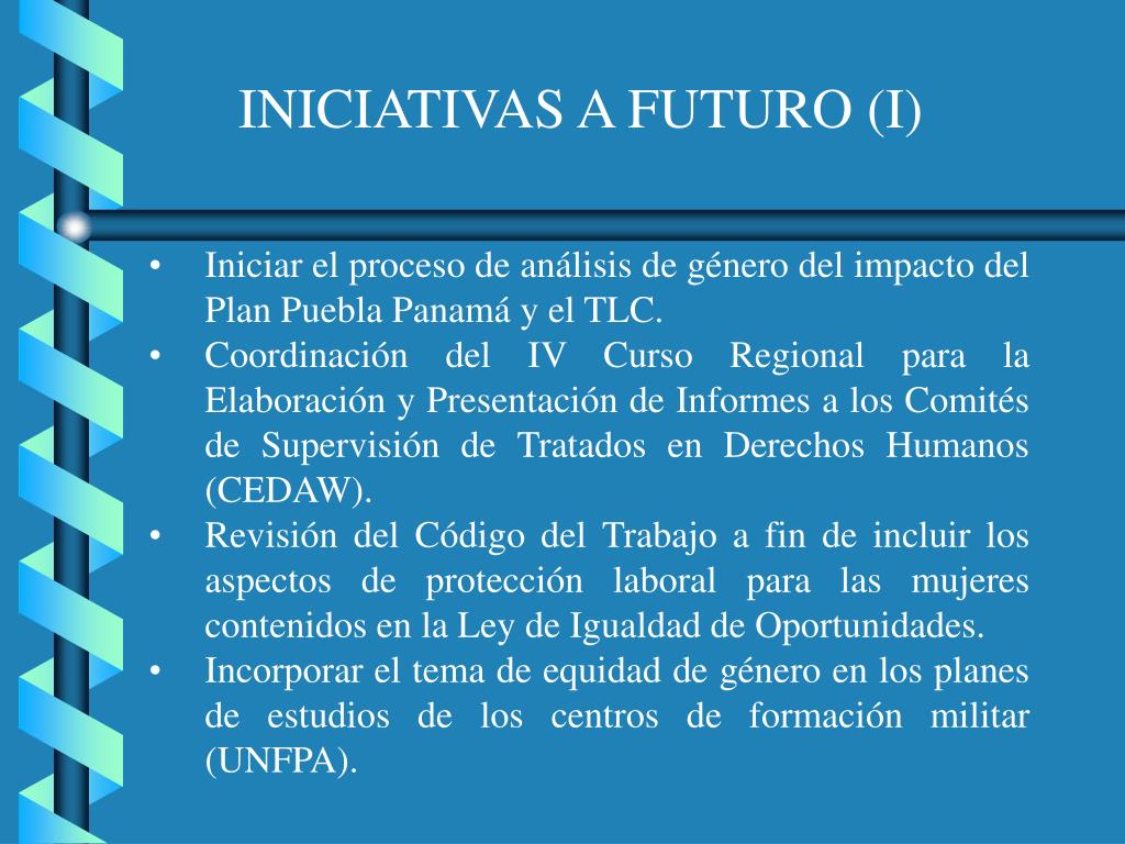 INICIATIVAS A FUTURO (I) • Iniciar el proceso de análisis de género del impacto del Plan Puebla Panamá y el TLC. • Coordinación del IV Curso Regional para la Elaboración y Presentación de Informes a los Comités de Supervisión de Tratados en Derechos Humanos (CEDAW). • Revisión del Código del Trabajo a fin de incluir los aspectos de protección laboral para las mujeres contenidos en la Ley de Igualdad de Oportunidades. • Incorporar el tema de equidad de género en los planes de estudios de los centros de formación militar (UNFPA).