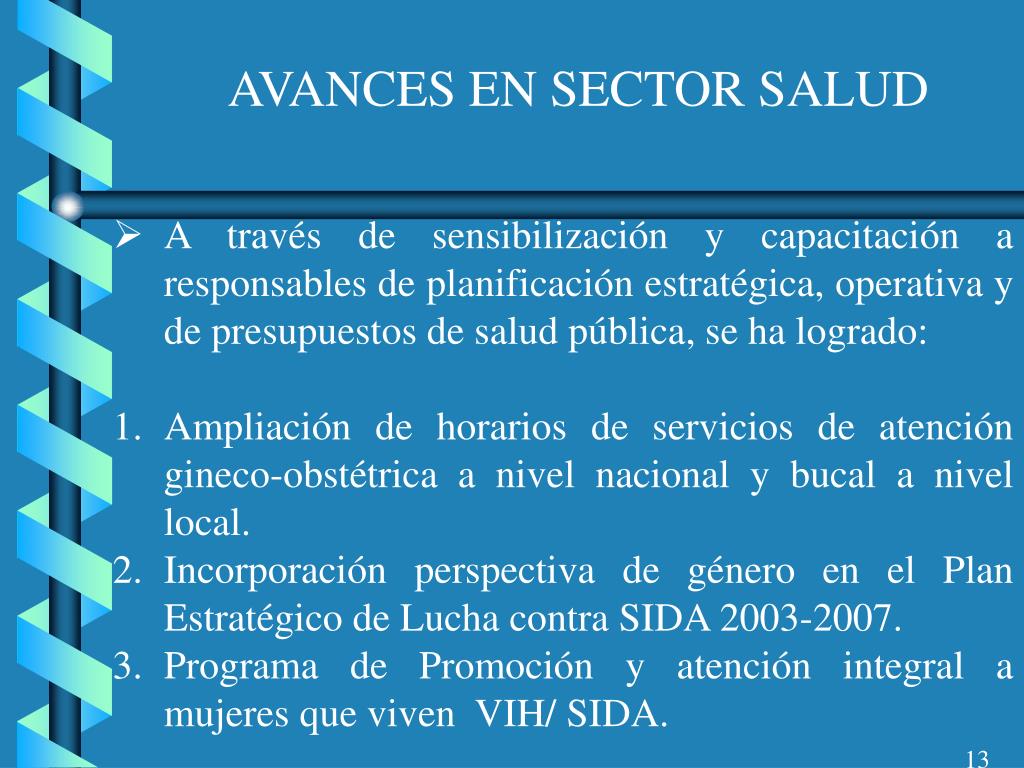 AVANCES EN SECTOR SALUD • A través de sensibilización y capacitacióna responsables de planificación estratégica, operativa y de presupuestos de salud pública, se ha logrado: • Ampliación de horarios de servicios de atención gineco-obstétrica a nivel nacional y bucal a nivel local. • Incorporación perspectiva de género en el Plan Estratégico de Lucha contra SIDA 2003-2007. • Programa de Promoción y atención integral a mujeres que viven VIH/ SIDA. 13