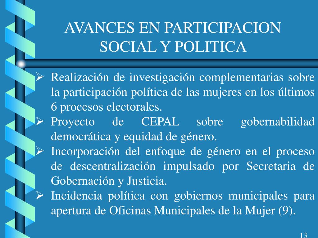 AVANCES EN PARTICIPACION SOCIAL Y POLITICA • Realización de investigación complementarias sobre la participación política de las mujeres en los últimos 6 procesos electorales. • Proyecto de CEPAL sobre gobernabilidad democrática y equidad de género. • Incorporación del enfoque de género en el proceso de descentralización impulsado por Secretaria de Gobernación y Justicia. • Incidencia política con gobiernos municipales para apertura de Oficinas Municipales de la Mujer (9). 13