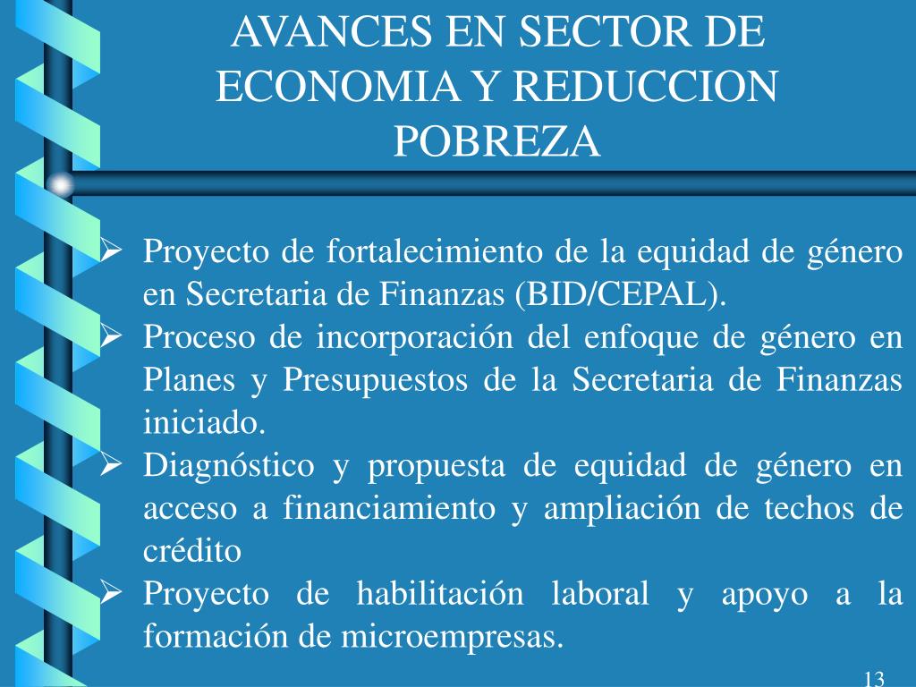 AVANCES EN SECTOR DE ECONOMIA Y REDUCCION POBREZA • Proyecto de fortalecimiento de la equidad de género en Secretaria de Finanzas (BID/CEPAL). • Proceso de incorporación del enfoque de género en Planes y Presupuestos de la Secretaria de Finanzas iniciado. • Diagnóstico y propuesta de equidad de género en acceso a financiamiento y ampliación de techos de crédito • Proyecto de habilitación laboral y apoyo a la formación de microempresas. 13