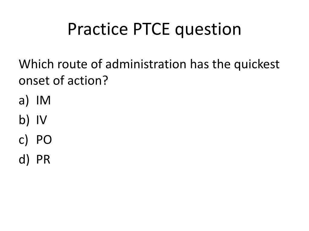 Practice PTCE question Which route of administration has the quickest onset of action? • IM (intramuscular, i.e. an injection) • IV • PO (by mouth) • PR (per rectum, i.e. a suppository) Answer is b) An intravenous (IV) injection will result in the quickest onset of action.