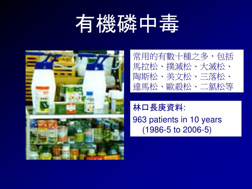 有機磷中毒 常用的有數十種之多,包括馬拉松、撲滅松、大滅松、陶斯松、美文松、三落松、達馬松、歐殺松、二氯松等 林口長庚資料: 963 patients in 10 years (1986-5 to 2006-5)