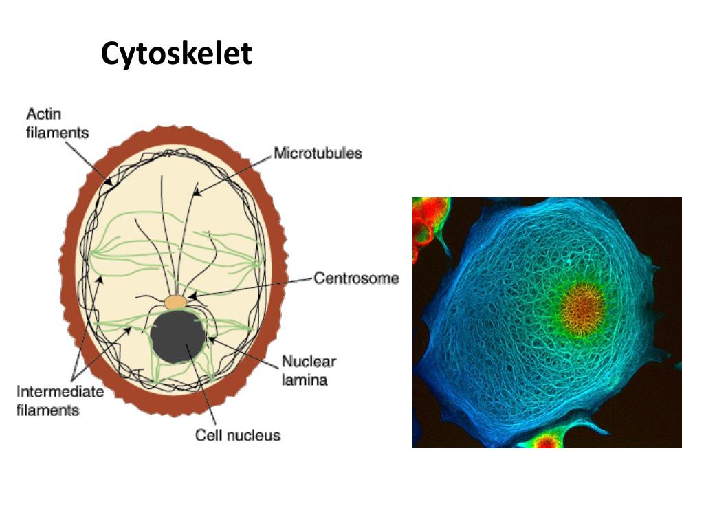 Cytoskelet • Netwerk van vezels en buizen: regelen activiteiten in cel • Microtubuli en microfilamenten. • Zitten aan desmosomen: stevigheid cel en regelen transport in de cel. • Microtubuli: zweepstaart zaadcel, trilharen luchtpijp, eileider. • Microfilamenten: spiercellen verkorten, chromosomen uit elkaar tijdens celdeling.
