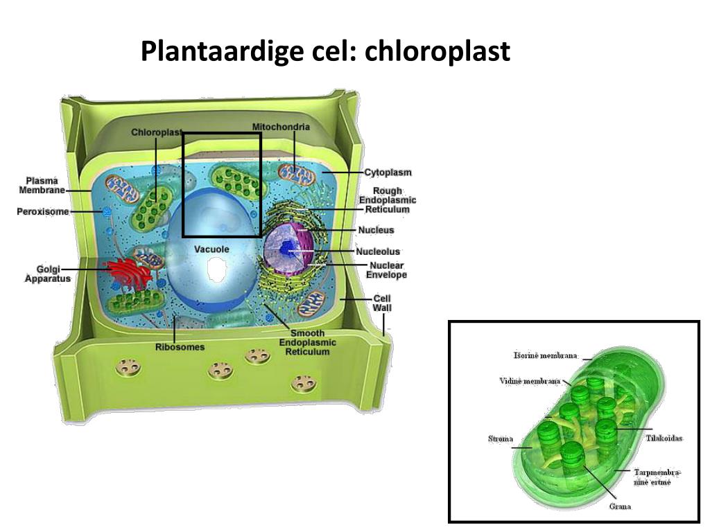 Chloroplasten • Eigen DNA en chlorofyl fotosynthese • Zonne-energie opgevangen: omgezet in chemische energie: glucose en zetmeel