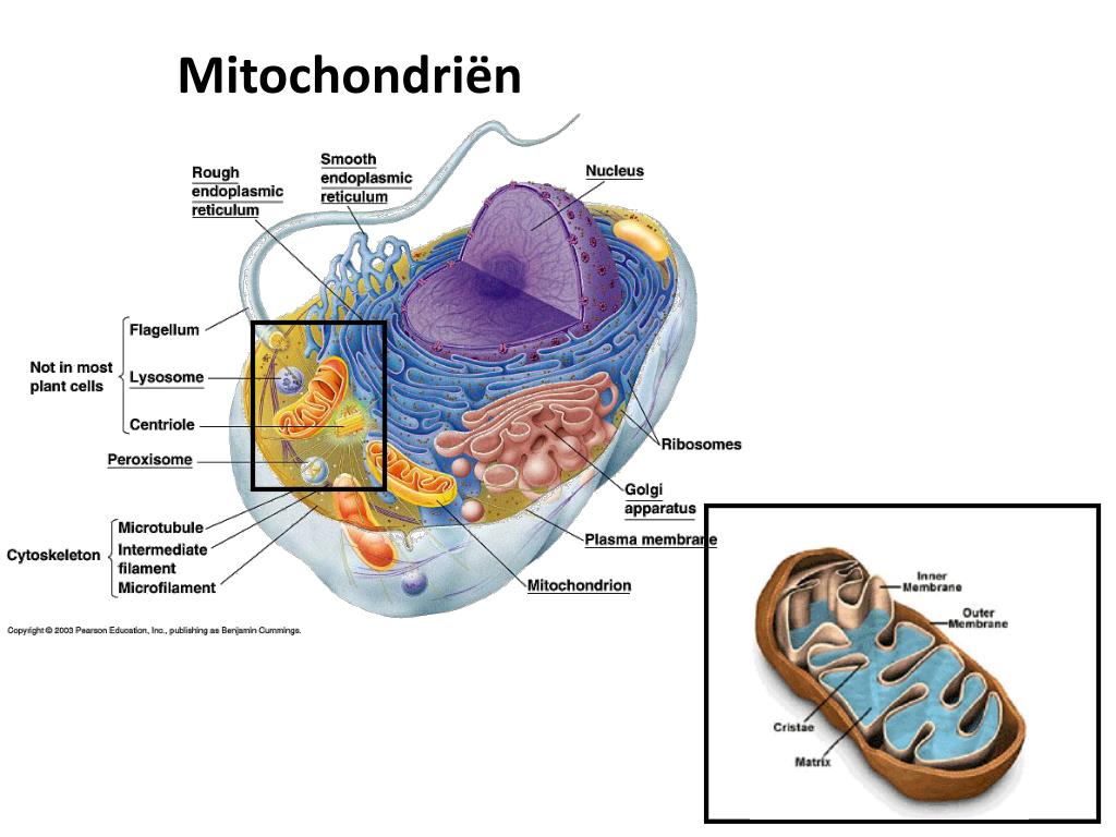 Mitochondriën • Bestaan uit twee membranen: vindt verbranding plaats. • Glucose + zuurstof uit cytoplasma • Op binnenste membraan: eiwitten: verbranding • Vrijgekomen energie opgeslagen in moleculen. Kunnen tijdens chemische reacties energie vrijmaken. • Mitochondriën hebben eigen DNA.