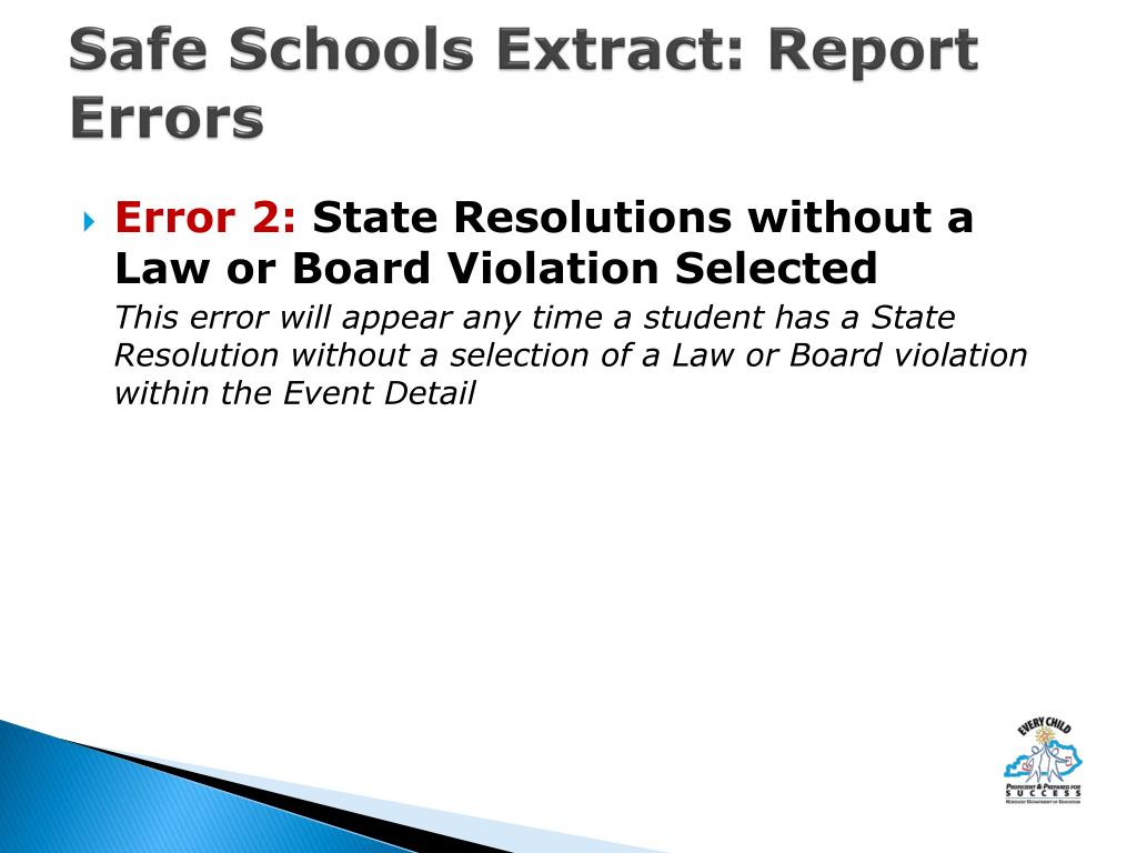 Safe Schools Extract: Report Errors • Error 2: State Resolutions without a Law or Board Violation Selected This error will appear any time a student has a State Resolution without a selection of a Law or Board violationwithin the Event Detail
