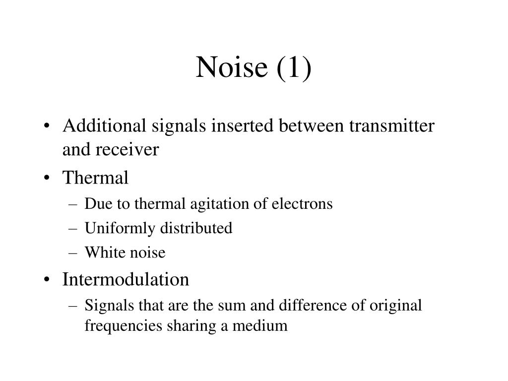 Noise (1) • Additional signals inserted between transmitter and receiver • Thermal • Due to thermal agitation of electrons • Uniformly distributed • White noise • Intermodulation • Signals that are the sum and difference of original frequencies sharing a medium