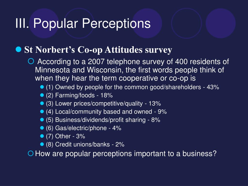 III. Popular Perceptions • St Norbert’s Co-op Attitudes survey • According to a 2007 telephone survey of 400 residents of Minnesota and Wisconsin, the first words people think of when they hear the term cooperative or co-op is • (1) Owned by people for the common good/shareholders - 43% • (2) Farming/foods - 18% • (3) Lower prices/competitive/quality - 13% • (4) Local/community based and owned - 9% • (5) Business/dividends/profit sharing - 8% • (6) Gas/electric/phone - 4% • (7) Other - 3% • (8) Credit unions/banks - 2% • How are popular perceptions important to a business?