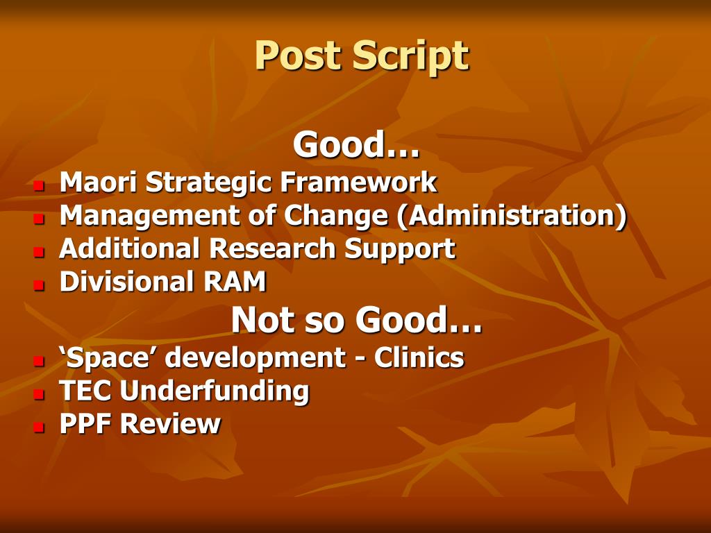Post Script Good… • Maori Strategic Framework • Management of Change (Administration) • Additional Research Support • Divisional RAM Not so Good… • ‘Space’ development - Clinics • TEC Underfunding • PPF Review