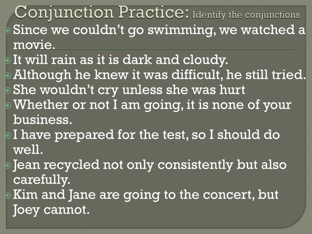 Conjunction Practice: Identify the conjunctions Since we couldn’t go swimming, we watched a movie. It will rain as it is dark and cloudy. Although he knew it was difficult, he still tried. She wouldn’t cry unless she was hurt Whether or not I am going, it is none of your business. I have prepared for the test, so I should do well. Jean recycled not only consistently but also carefully. Kim and Jane are going to the concert, but Joey cannot.