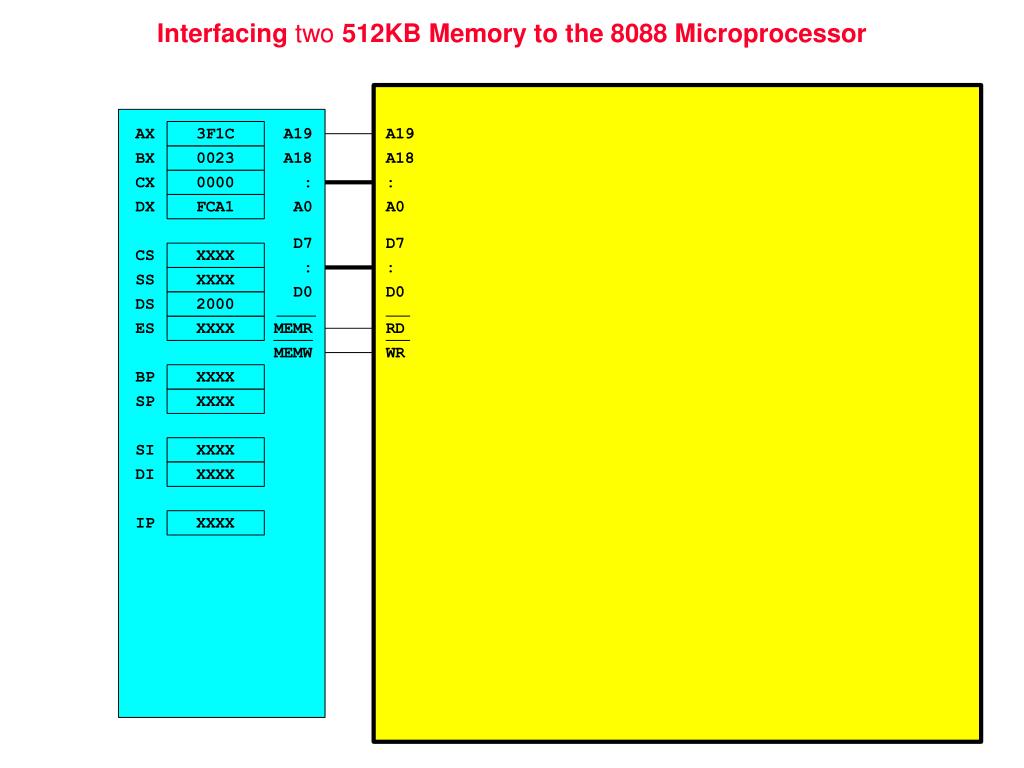 AX 3F1C A19 7FFFF 36 BX 0023 A18 A18 7FFFE 25 CX 0000 : : 7FFFD 19 DX FCA1 A0 A0 : : 20023 13 D7 D7 CS XXXX 20022 7D : : SS XXXX 20021 12 D0 D0 DS 2000 20020 29 ES XXXX MEMR RD : : MEMW WR 00001 95 BP XXXX CS 00000 23 SP XXXX SI XXXX 7FFFF 12 DI XXXX A18 7FFFE 98 : 7FFFD 2C IP XXXX A0 : : 20023 33 D7 20022 45 20021 92 D0 20020 A3 : : 00001 D4 00000 97 Interfacing two 512KB Memory to the 8088 Microprocessor : RD WR CS