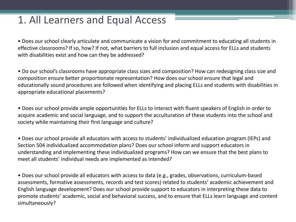 1. All Learners and Equal Access • Does our school clearly articulate and communicate a vision for and commitment to educating all students in effective classrooms? If so, how? If not, what barriers to full inclusion and equal access for ELLs and students with disabilities exist and how can they be addressed? • Do our school’s classrooms have appropriate class sizes and composition? How can redesigning class size and composition ensure better proportionate representation? How does our school ensure that legal and educationally sound procedures are followed when identifying and placing ELLs and students with disabilities in appropriate educational placements? • Does our school provide ample opportunities for ELLs to interact with fluent speakers of English in order to acquire academic and social language, and to support the acculturation of these students into the school and society while maintaining their first language and culture? • Does our school provide all educators with access to students’ individualized education program (IEPs) and Section 504 individualized accommodation plans? Does our school inform and support educators in understanding and implementing these individualized programs? How can we ensure that the best plans to meet all students’ individual needs are implemented as intended? • Does our school provide all educators with access to data (e.g., grades, observations, curriculum-based assessments, formative assessments, records and test scores) related to students’ academic achievement and English language development? Does our school provide support to educators in interpreting these data to promote students’ academic, social and behavioral success, and to ensure that ELLs learn language and content simultaneously?