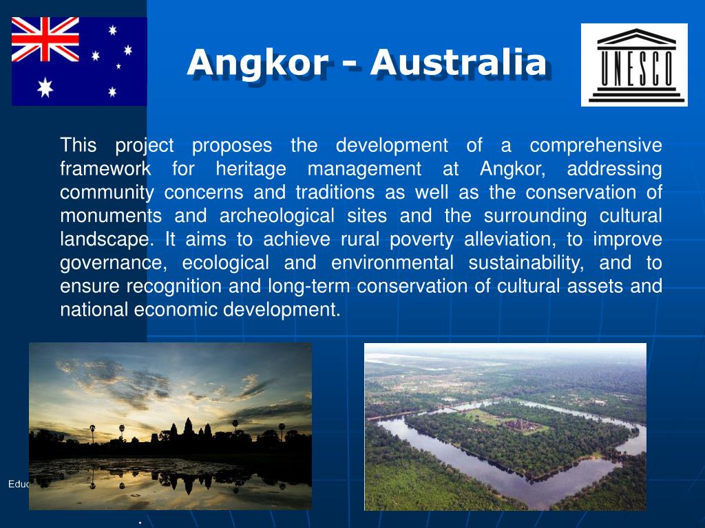 Angkor - Australia This project proposes the development of a comprehensive framework for heritage management at Angkor, addressing community concerns and traditions as well as the conservation of monuments and archeological sites and the surrounding cultural landscape. It aims to achieve rural poverty alleviation, to improve governance, ecological and environmental sustainability, and to ensure recognition and long-term conservation of cultural assets and national economic development.