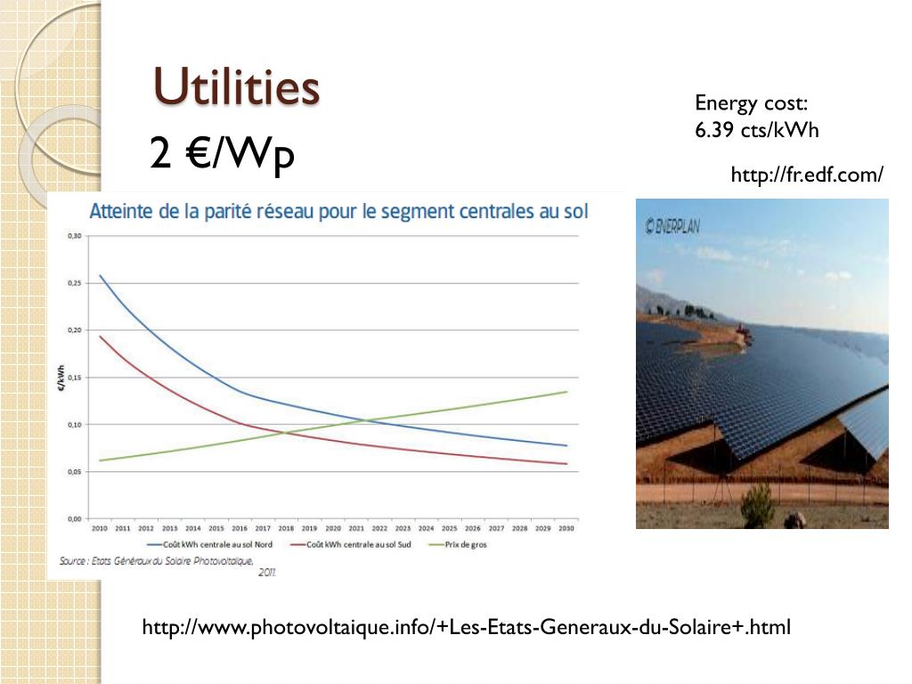 Utilities Energycost: 6.39 cts/kWh 2 €/Wp http://fr.edf.com/ http://www.photovoltaique.info/+Les-Etats-Generaux-du-Solaire+.html